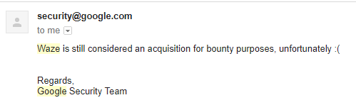 Hey guys! hope you all doing well :), In June/July i decided to hunt on Google Products, As Google have almost everything in scope so i gone though list of Google products/fully integrated acquisitions. ( https://www.google.com/intl/en/about/products/ ), Waze is one of Google's Fully integrated acquisitions (There's difference b/w integrated and non-integrated). So i decided to give it a try :)